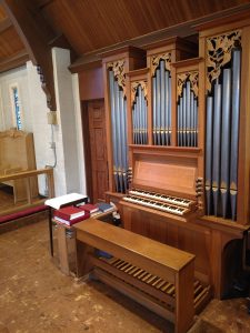 The day’s program, organized by Curt Sather, organist at St. John’s Episcopal Church in Olympia, reconvened at Faith Lutheran Church. The organ at Faith Lutheran, Opus 595 of Henry Pilcher’s Sons, was built in 1907 and delivered to First Baptist Church of Sidney, OH. Failing to recognize their good fortune, the Ohio Baptists sold the organ in 1979 but retained the case to house the electronic device they were purchasing. Thus, in its Shelton home, the organ is housed by a makeshift case of plywood and glass. The organ has two manuals, 13 stops, with a 30-note pedalboard.