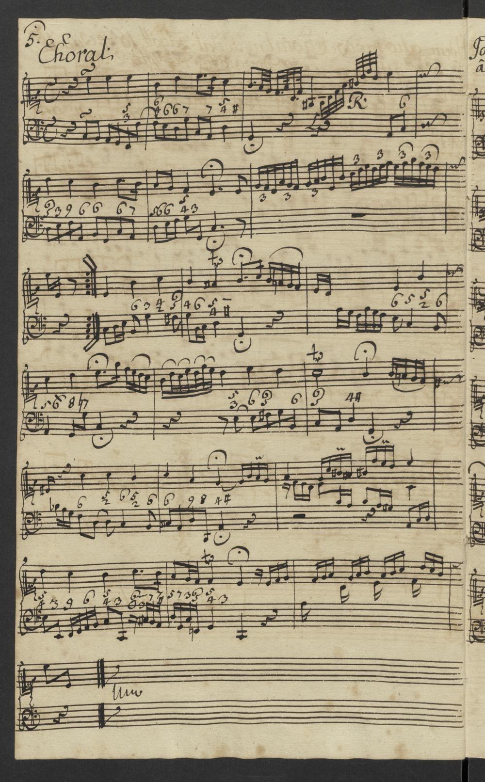 The chorale setting of Ein feste Burg in the original manuscript, showing the figured bass chorale and Zwischenspiel at the end of each phrase.